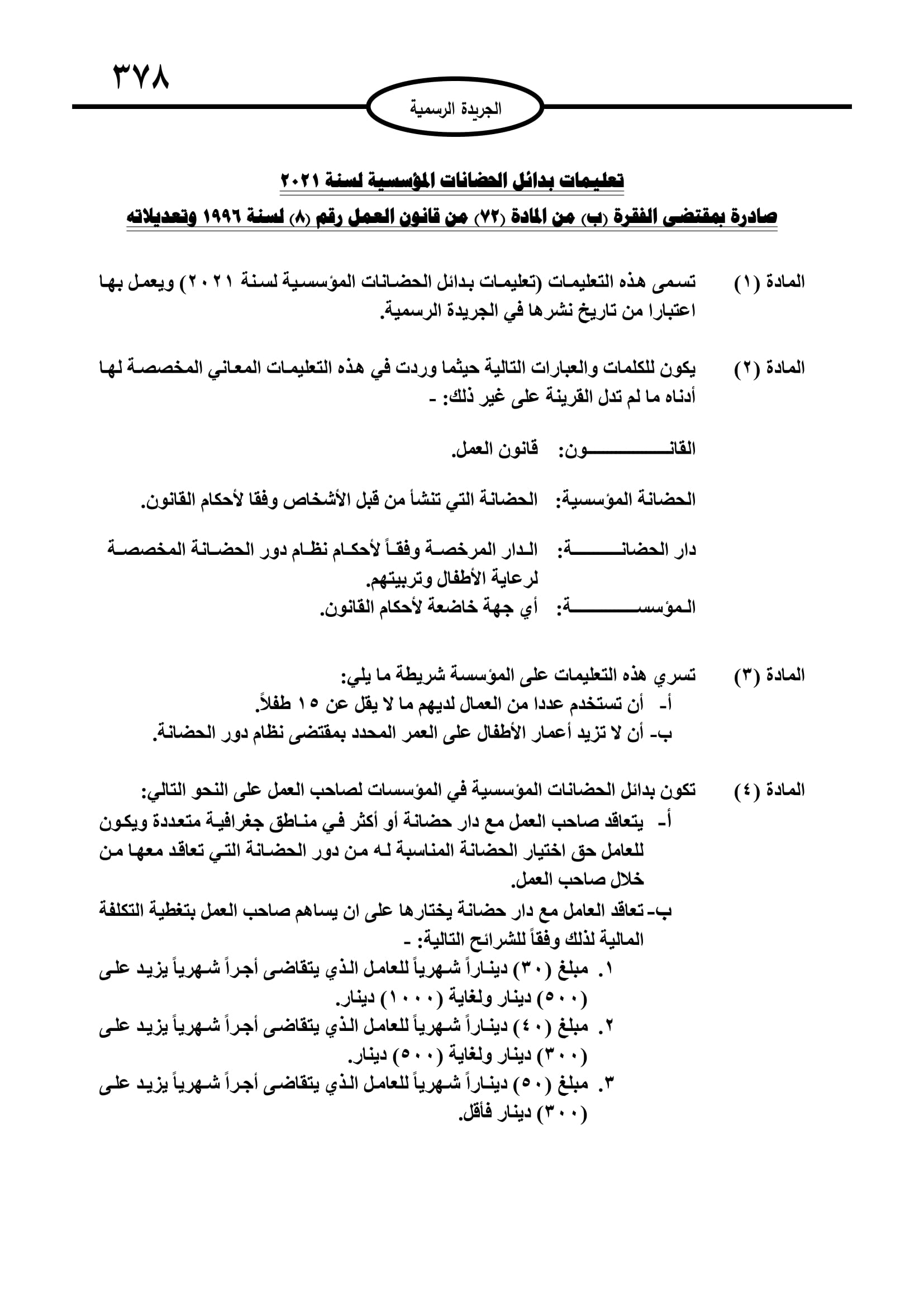 مرايا – صدر في عدد الجريدة الرسمية اليوم الاثنين، تعليمات بدائل الحضانات المؤسسية لسنة 2021، والقاضية بدفع بدل حضانات لموظفي المؤسسات الخاضعة لاحكام قانون العمل.