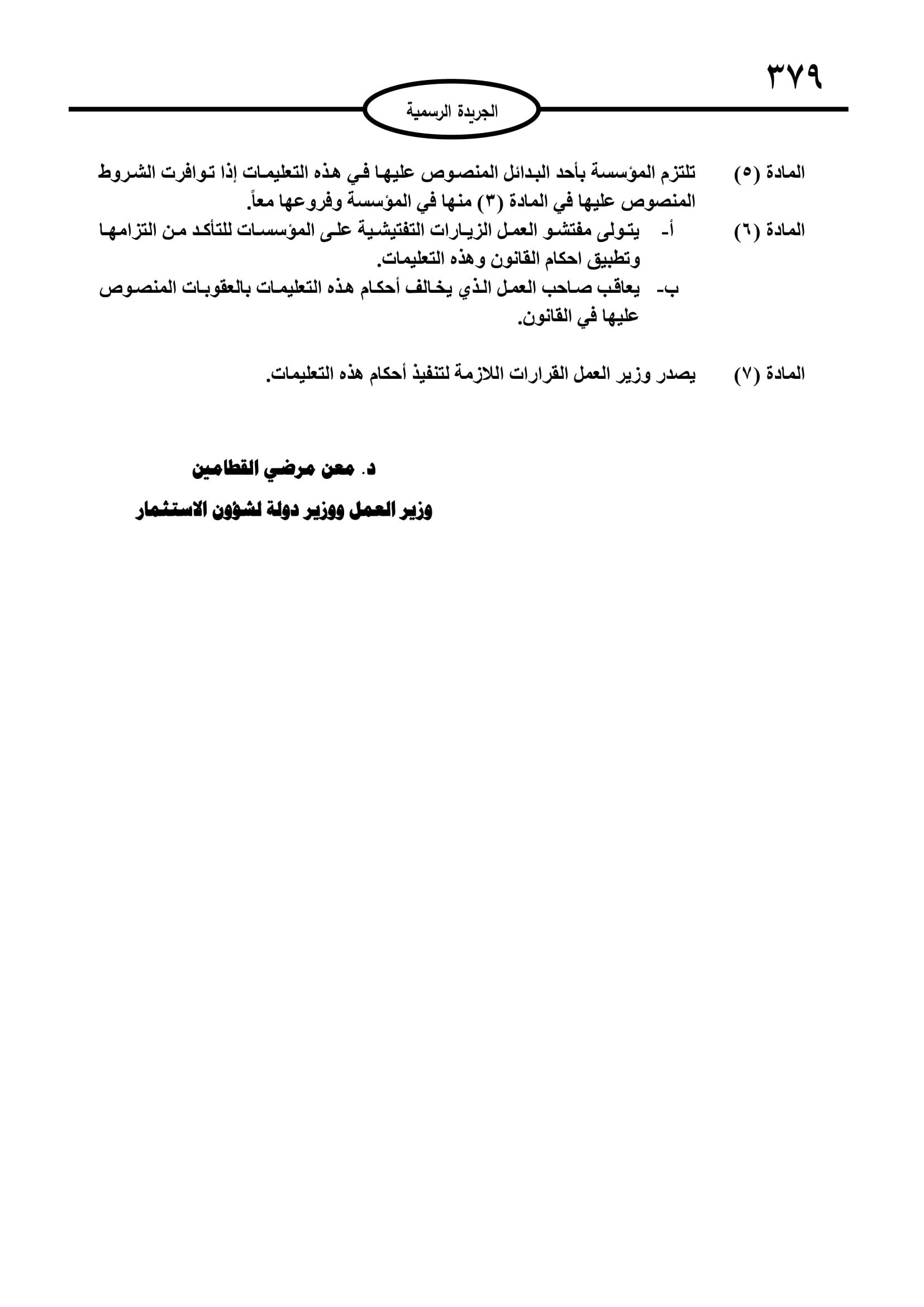 ويبدأ العمل بالتعليمات اعتبارا من نشرها في الجريدة الرسمية، ويعاقب صاحب العمل الذي يخالف هذه التعليمات بالعقوبات المنصوص عليها في قانون العمل.