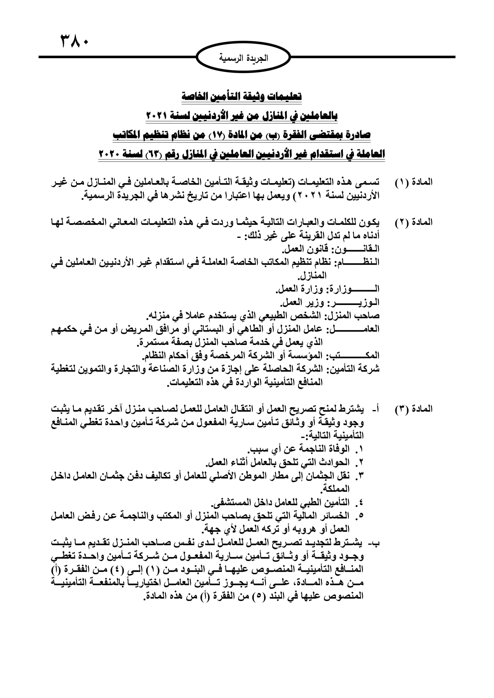 مرايا – اصدر وزير العمل وشؤون الاستثمار الدكتور معن القطامين تعليمات وثيقة التأمين الخاصة بالعاملين في المنازل من غير الاردنين.