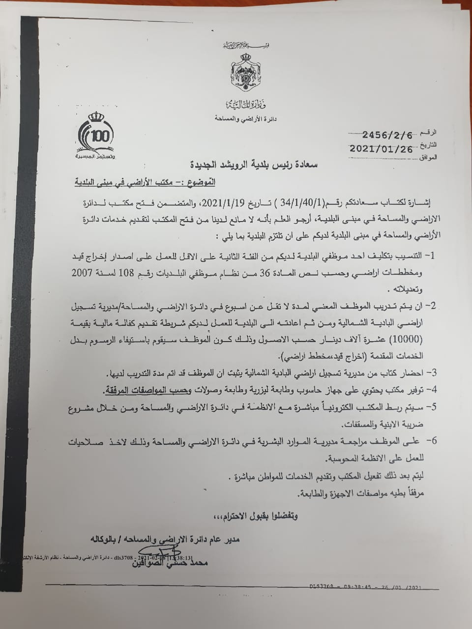 وطلبت دائرة الاراضي والمساحة من بلدية الرويشد التنسيب بموظف من البلدية للعمل على اصدار إخراج قيد ومخططات اراضي ليتم تدريبه لمدة لا تقل عن اسبوع في مديرية تسجيل اراضي البادية، وتوفير مكتب يحتوي على جهاز حاسوب وطابعة ليزرية ليتم ربط المكتب مباشرة مع الانظمة في دائرة الاراضي ومباشرة العمل فيه.