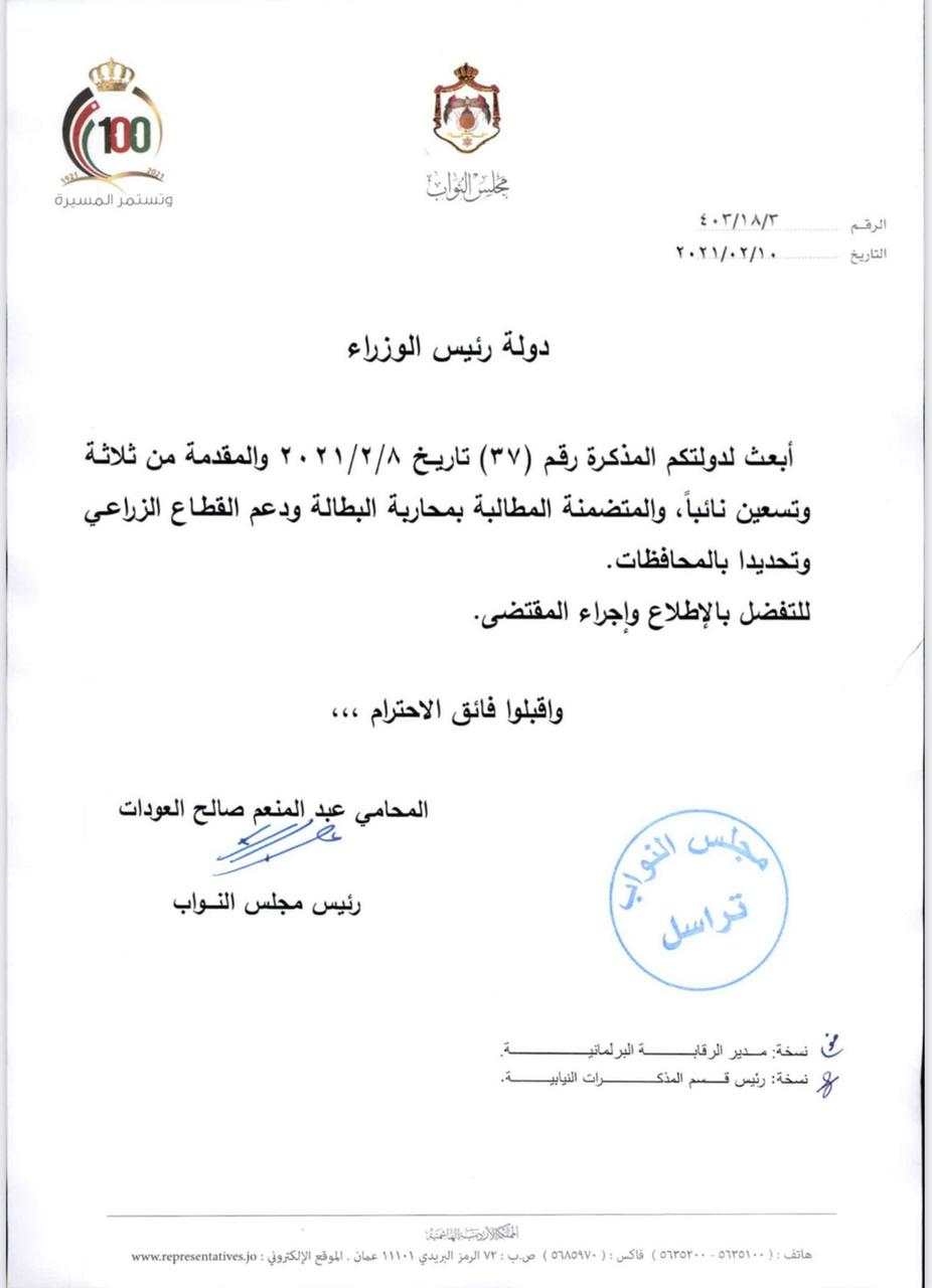 مرايا – طالب 93 نائباً في مذكرة نيابية تبناها النائب ايمن المجالي باستغلال الاراض المملوكة للدولة وذلك عبر تخصيص قطع من هذه الأراضي ذات المساحات الصغيرة لمجموعات من الشباب المتعطلين عن العمل ليقوموا بزراعتها وتطويرها ضمن الأنماط الزراعية المحددة.
