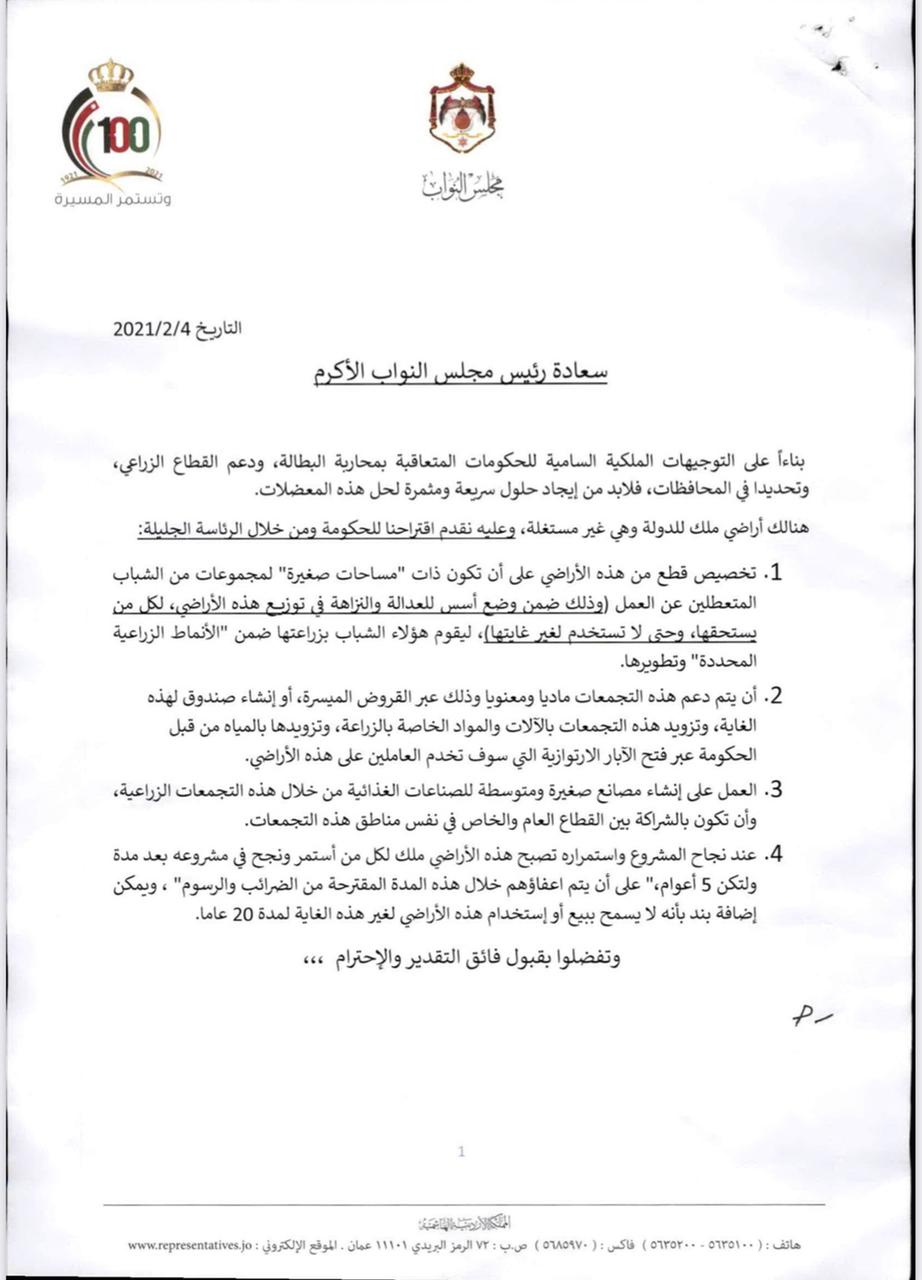 وأشارت المذكرة التي وجهت إلى رئيس مجلس النواب، المحامي عبدالمنعم العودات، الخميس، لمخاطبة رئيس الوزراء، الدكتور بشر الخصاونة، الى ضرورة ان يكون توزيع تلك الأراضي ضمن أسس عادلة ونزيهة لكل من يستحقها، وحتى لا تستخدم لغير غايتها.