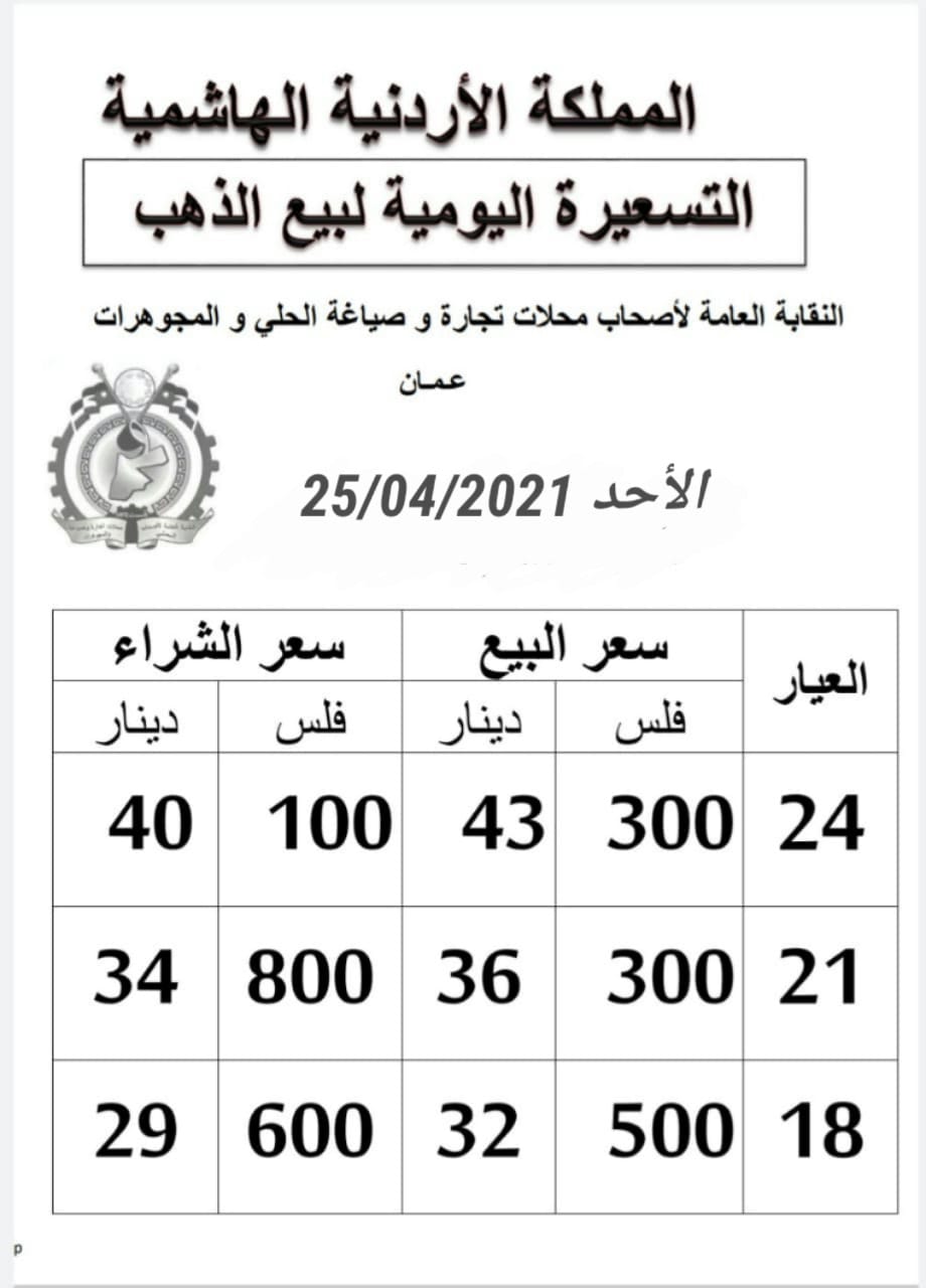 وبحسب التسعيرة اليومية للنقابة العامة لأصحاب محلات تجارة وصياغة الحلي والمجوهرات، بلغ سعر بيع الغرام من الذهب عياري 24 و18 لغايات الشراء من محلات الصاغة عند 43.30 و32.50 دينارا على التوالي.