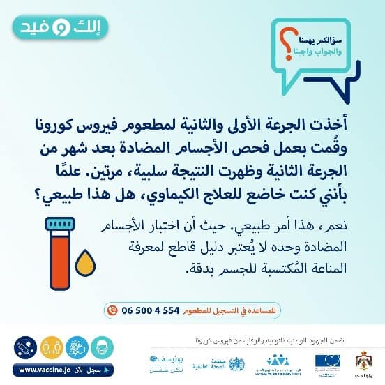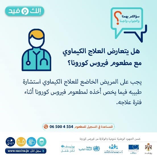 وردا على سؤال اخر أكدت الوزارة أنه على المريض الخاضع للعلاج الكيماوي استشارة طبيبه فيما يخص أخذه لمطعوم كورونا أثناء فترة العلاج.