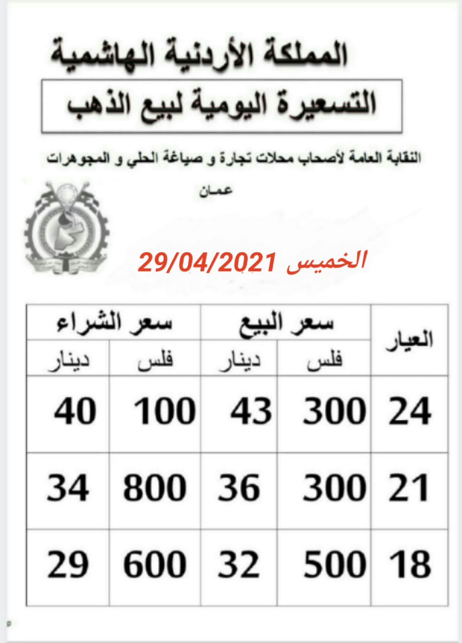 وبحسب التسعيرة اليومية للنقابة العامة لأصحاب محلات تجارة وصياغة الحلي والمجوهرات، بلغ سعر بيع الغرام من الذهب عياري 24 و18 لغايات الشراء من محلات الصاغة عند 43.30 و32.50 دينارا على التوالي.