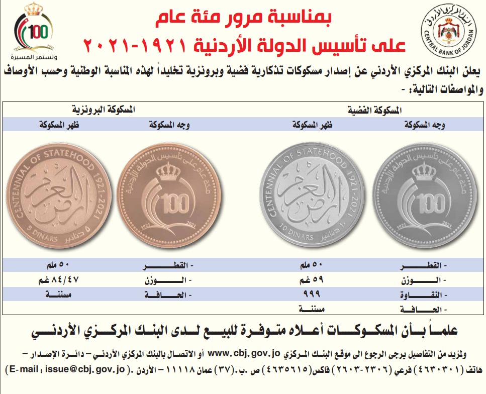 أعلن البنك المركزي الأردني، الثلاثاء، عن إصدار مسكوكات تذكارية فضية وبرونزية لمرور 100 عام على تأسيس الدول الأردنية.