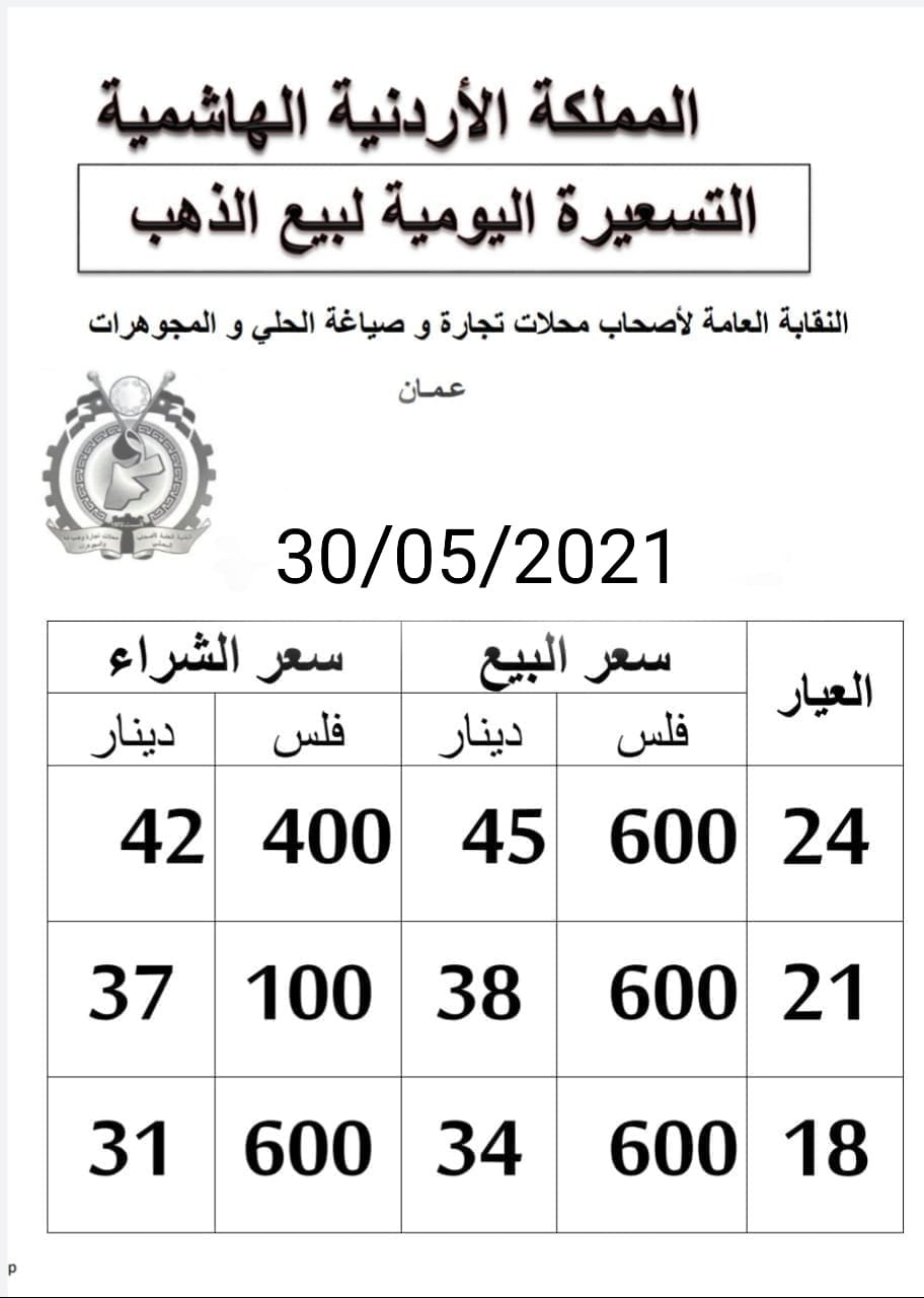 ووفق التسعيرة اليومية الصادرة عن النقابة العامة لأصحاب محلات تجارة وصياغة الحلي والمجوهرات بلغ سعر بيع الغرام من الذهب عياري 24 و18 لغايات الشراء من محلات الصاغة عند 45.60 و 34.60 دينارا على التوالي.