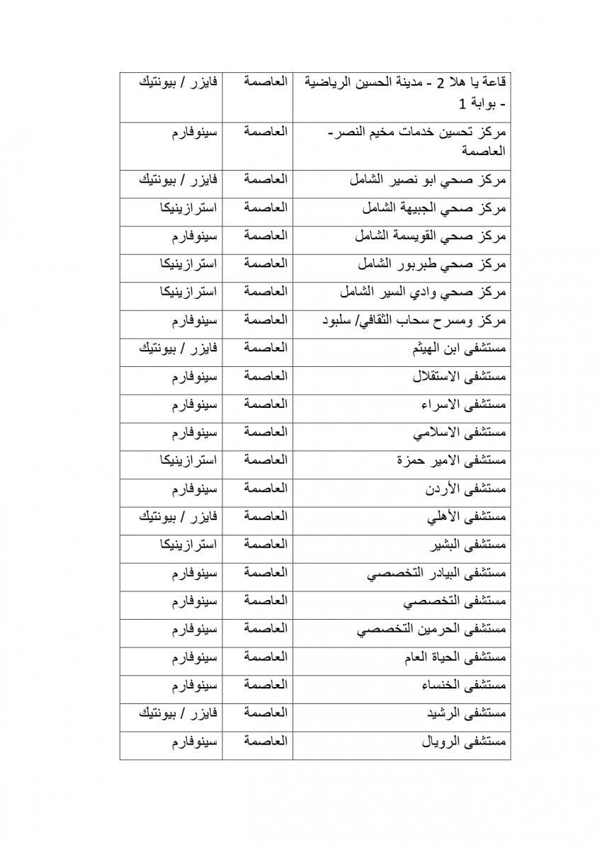 ونوهت الوزارة أيضا أنه باستطاعة من تخلف عن اخذ الجرعة الثانية سابقا التوجه الى احد هذه المراكز وبدون موعد مسبق لاخذ جرعته الثانية من احد هذه المراكز التي تتوافر فيها نفس نوع جرعة المطعوم التي تلقاها سابقا وبدون موعد مسبق، مع ضرورة الانتباه الى نوع الجرعة الاولى من المطعوم التي تلقاها سابقا.