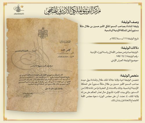 عرض مركز التوثيق الملكي الهاشمي اليوم الأربعاء، وثيقة المناداة بالأمير الحسين بن طلال ملكا دستوريا على المملكة يرجع تاريخها إلى مثل هذا اليوم 11 آب من عام 1952.