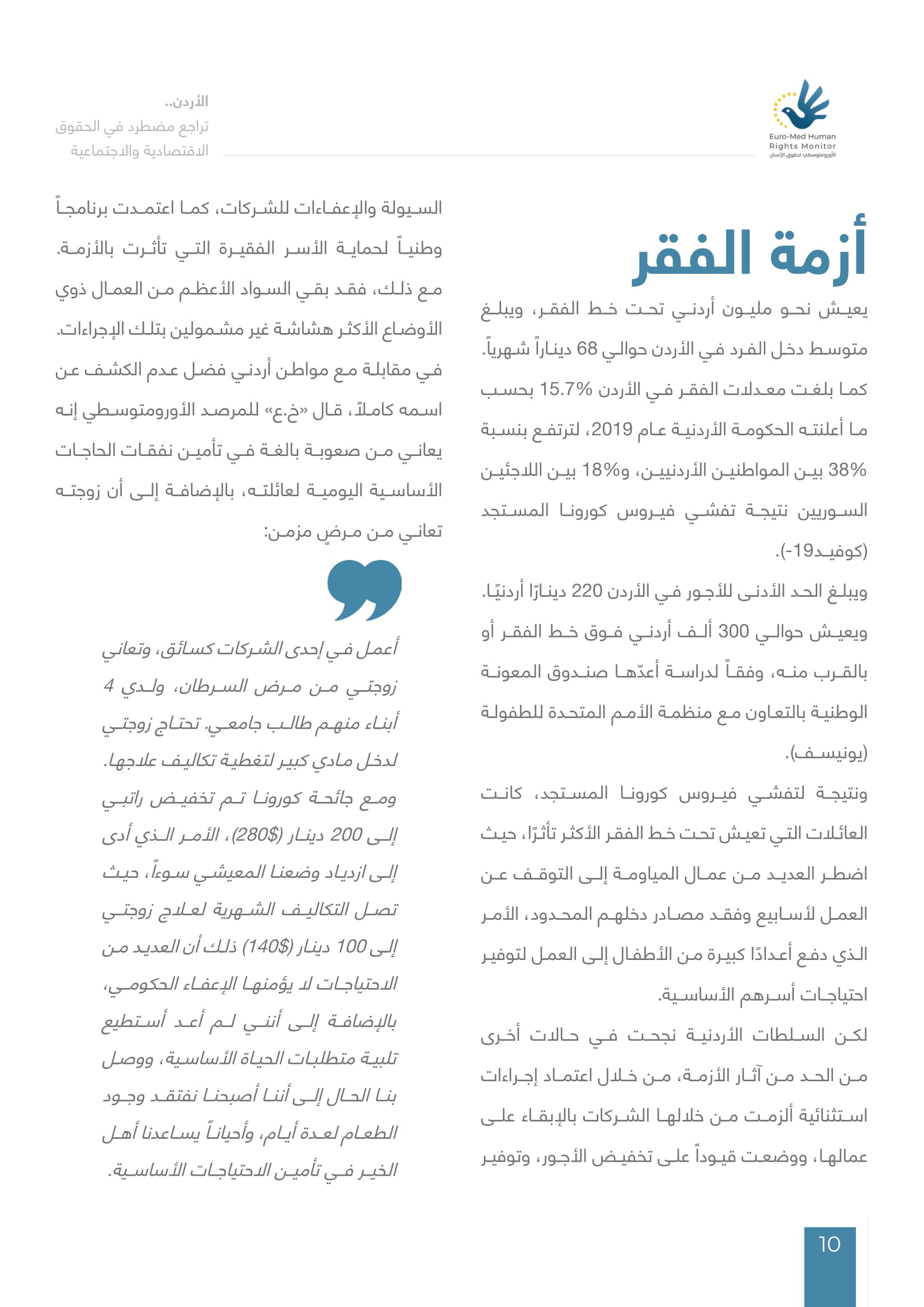 وقال الباحث القانوني في المرصد الأورومتوسطي “عمر العجلوني” إنّ الحكومة الأردنية ملزمة بموجب المادة (25) من الإعلان العالمي لحقوق الإنسان بضمان حق كل فرد في مستوى معيشة يكفي لضمان الصحة والرفاهية له ولأسرته، وخاصة على صعيد المأكل والملبس والمسكن والعناية الطبية وصعيد الخدمات الاجتماعية الضرورية.