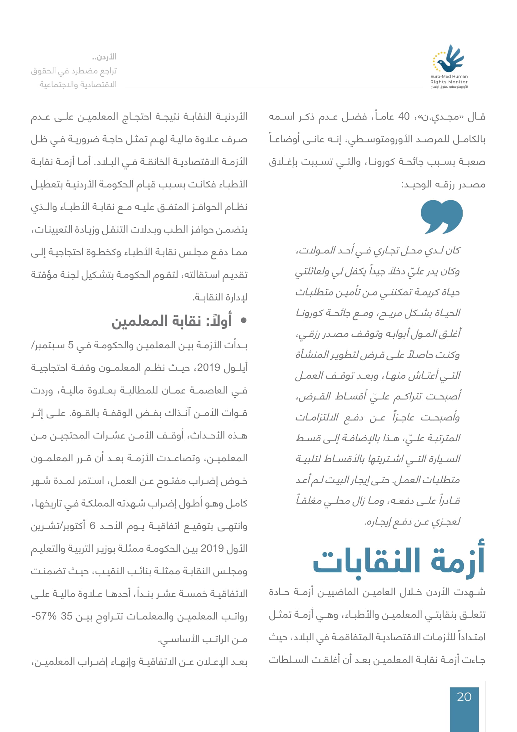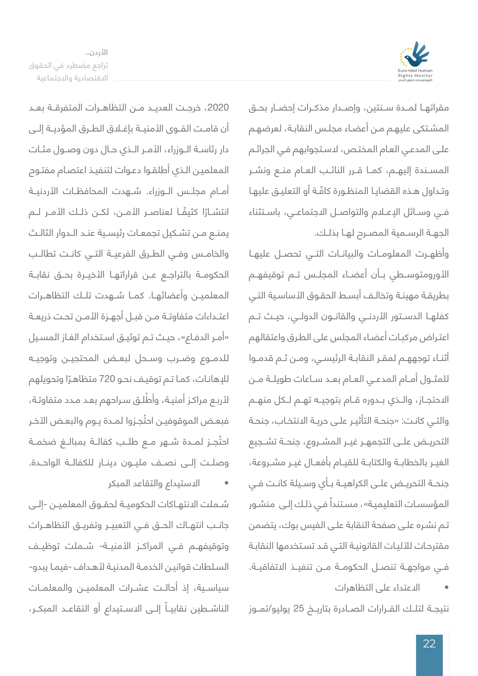 واستعرض المرصد الأورومتوسطي -ومقرّه جنيف-، في تقريره بعنوان “الأردن.. تراجع مضطرد في الحقوق الاقتصادية والاجتماعية”، الظروف الصعبة التي طرأت على المملكة الأردنية الهاشمية في السنوات الأخيرة نتيجة لتراجع النشاط الاقتصادي، وتفاقم أزمة فيروس كورونا المستجد، وتراجع المساعدات المالية المقدمة للاجئين في المملكة، فضلاً عن شبهات انتشار الفساد والتهرب الضريبي، وزيادة أعباء الدين العام سواءً الداخلي أو الخارجي.