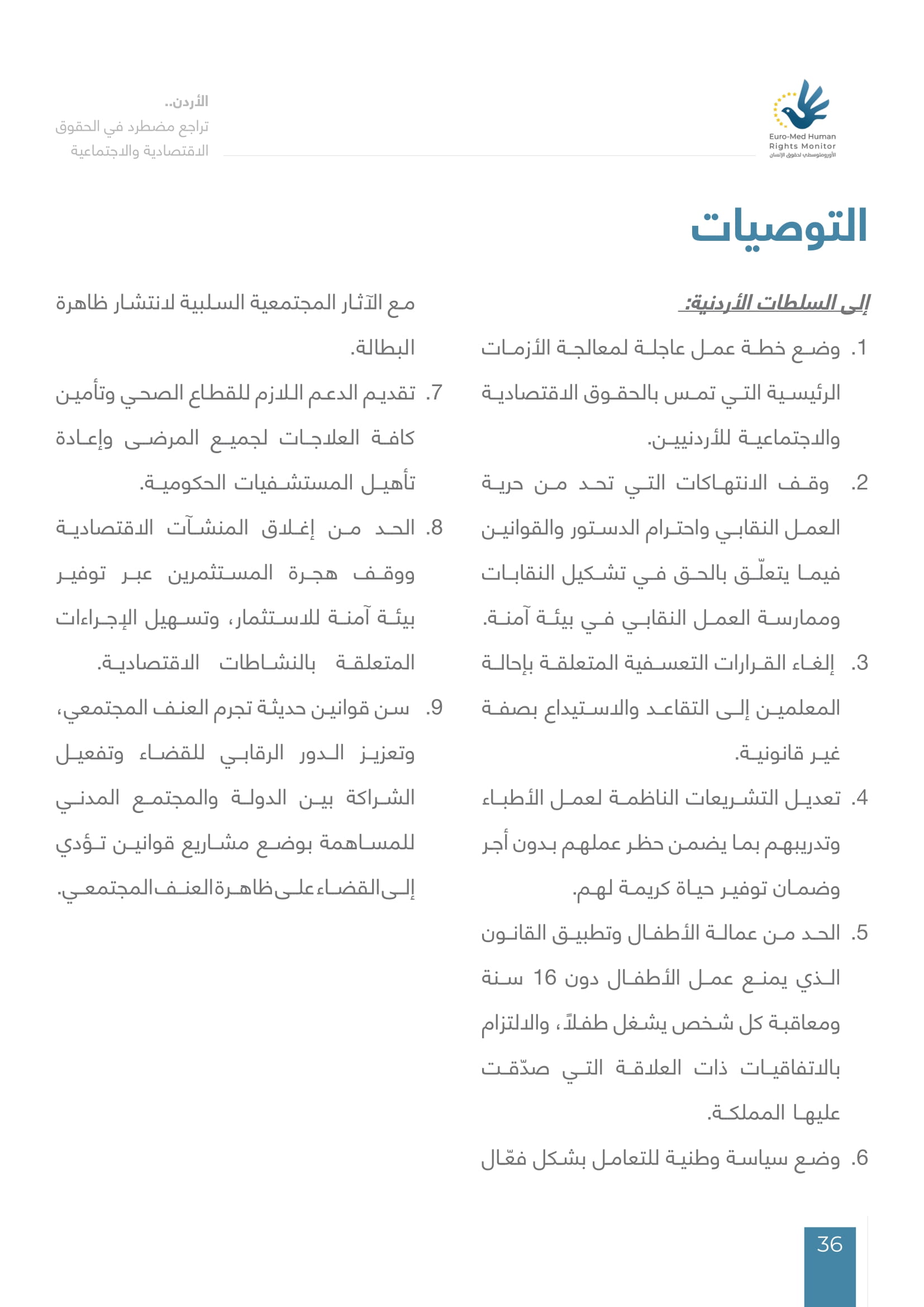 وأوصى المرصد الأورومتوسطي السلطات الأردنية بضرورة وضع سياسة وطنية للتعامل بشكل فعّال مع هذه الأزمات، خاصةً تلك التي تتعلق بالفقر والبطالة والعنف المجتمعي الناجم عنها، كما حث السلطات على وقف الانتهاكات التي تحد من حرية العمل النقابي في جو مريح، سواء أكان ذلك للمؤسسات النقابية أو الناشطين في العمل النقابي.
