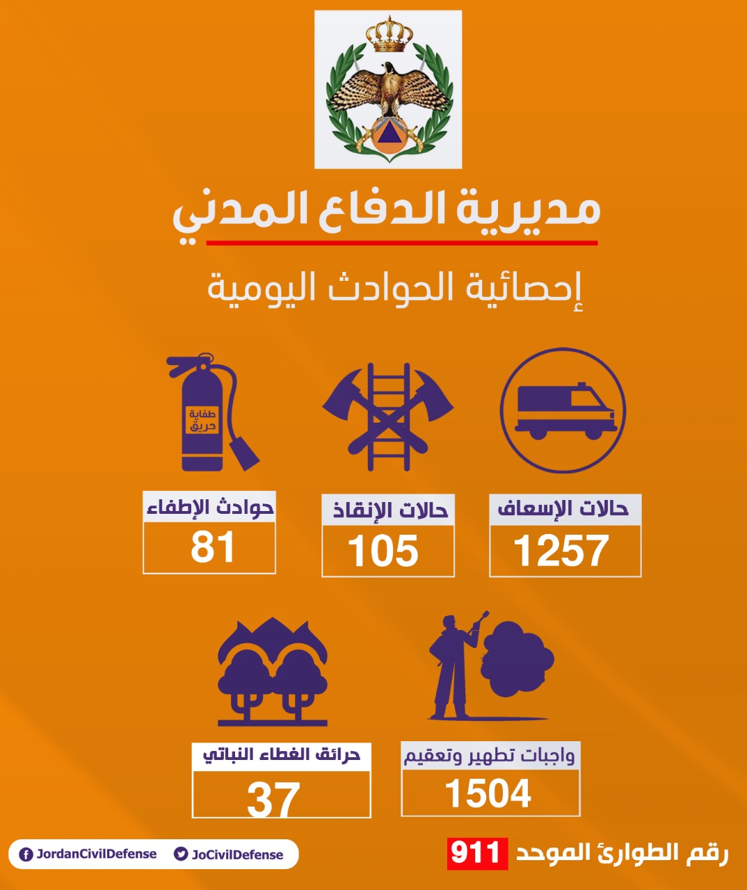 تعاملت مديرية الدفاع المدني خلال 24 ساعة الماضية مع (1257) حالة إسعافية مختلفة.