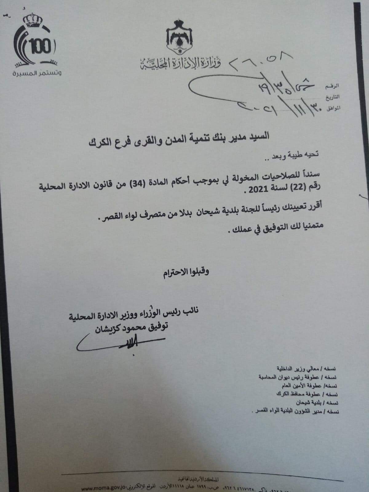 قرر نائب رئيس الوزراء وزير الادارة المحلية توفيق كريشان تعيين مدير بنك تنمية المدن والقرى فرع الكرك رئيسا للجنة بلدية شيحان بدلا من متصرف لواء القصر.