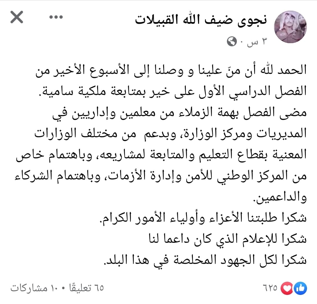 وقالت الدكتورة قبيلات في إدارج لها عبر فيسبوك، “الحمد لله أن منّ علينا و وصلنا إلى الأسبوع الأخير من الفصل الدراسي الأول على خير بمتابعة ملكية سامية”.
