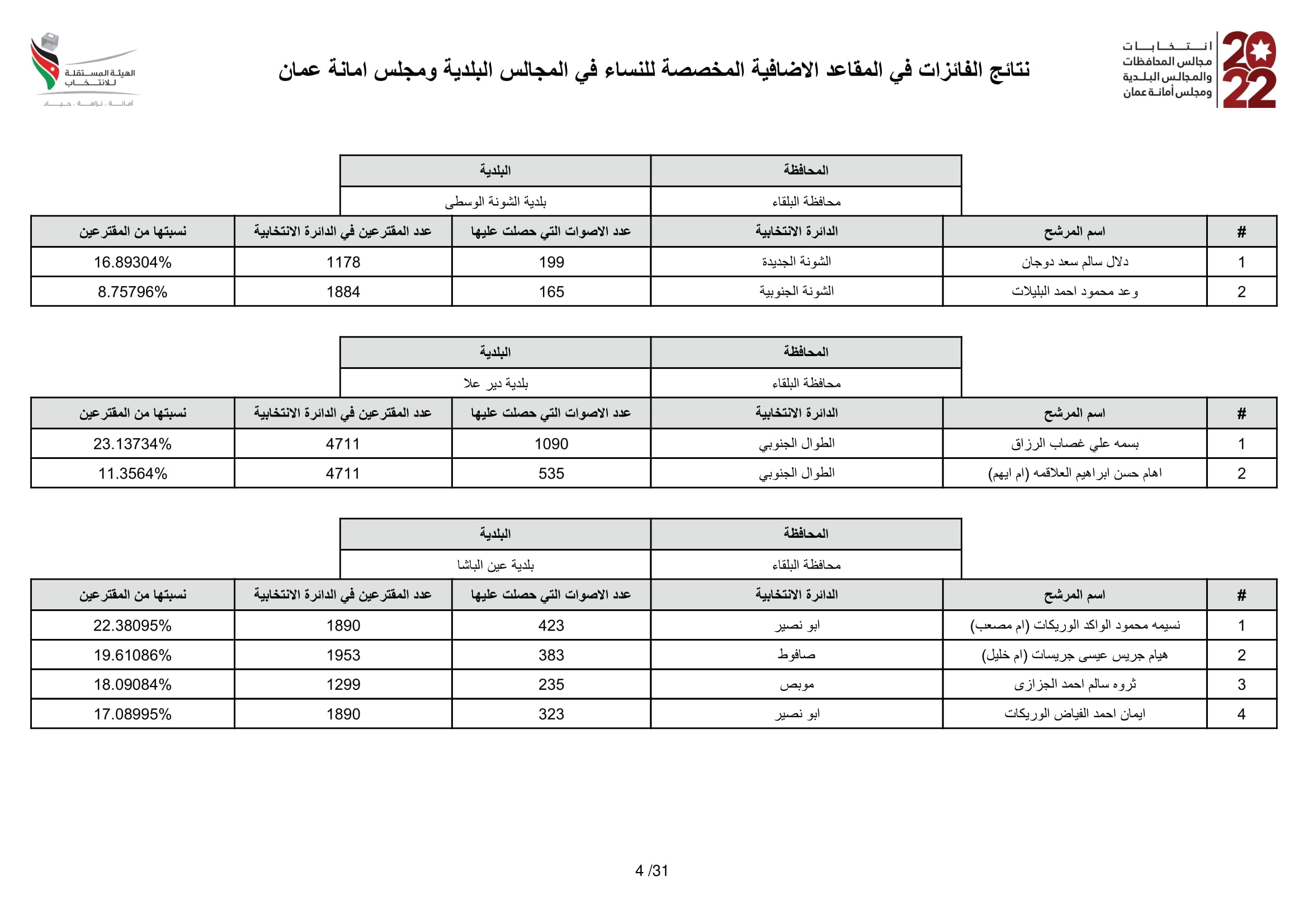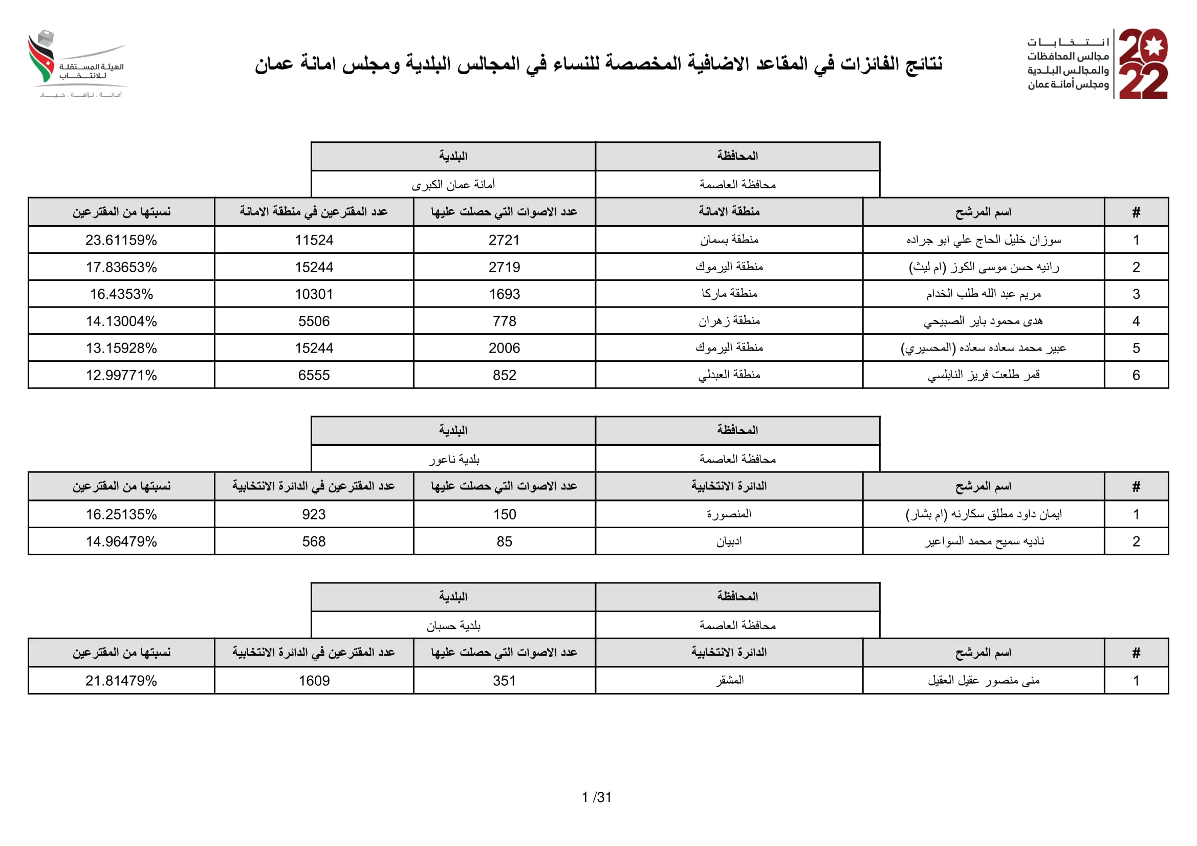 مرايا – ينشر اليكم موقع مرايا النتائج النهائية للفائزات ﻓﻲ اﻟﻤﻘﺎﻋﺪ اﻻﺿﺎﻓﻴﺔ اﻟﻤﺨﺼﺼﺔ ﻟﻠﻨﺴﺎء ﻓﻲ اﻟﻤﺠﺎﻟﺲ اﻟﺒﻠﺪﻳﺔ وﻣﺠﻠﺲ اﻣﺎﻧﺔ ﻋﻤﺎن.