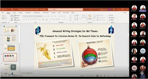 وقد قدمت الورشة الدكتورة سائدة السيد عميدة كلية الدراسات العليا عبر “منصة التميز”، بحضور عميد كلية الأعمال الاستاذ الدكتورمعاذ شبيطة ونخبة من أعضاء الهيئة التدريسية من مختلف أقسام الكلية.