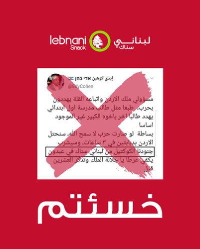 وأضافت: “لبناني سناك محرم على امثالكم، ولن تشربوا عنده إلا السم الزعاف الذي يليق بامثالكم ايها الغاصبون المعتدون، ومعركه الكرامة ليست منكم ببعيد فقد داسكم رجال الجيش العربي في الملحمة البطولية وانتم مكبلون داخل دباباتكم التي ابيدت على ايدي النشامى الاحرار”.