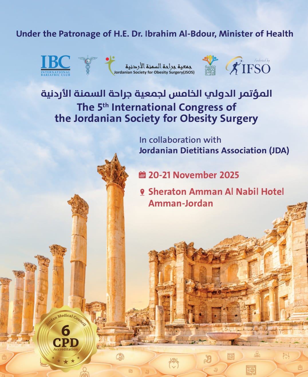 تعقد جمعية جراحة السمنة الأردنية بنقابة الأطباء مؤتمرها الدولي الخامس تحت رعاية وزير الصحة الدكتور ابراهيم البدور، وذلك على مدى يومي الخميس والجمعة في فندق الشيراتون.