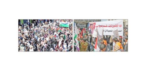دعماً وتأييداً وولاءً لجلالة الملك عبدالله الثاني، انطلقت صباح أمس الجمعة من أمام المسجد الحسيني في منطقة وسط البلد بعمّان مسيرة حاشدة، سارت إلى منطقة ساحة النخيل.