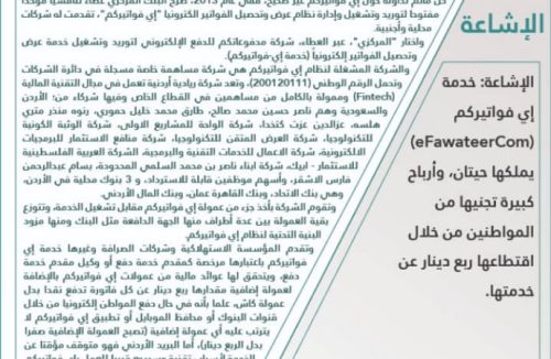 وبين ان الشركة المشغلة لنظام أي فواتيركم هي شركة مساهمة خاصة مسجلة في دائرة الشركات، وتحمل الرقم الوطني 2001120111؛ وتعد شركة أردنية ريادية تعمل في مجال التنمية المالية وممولة بالكامل من مساهمين بالقطاع الخاص.