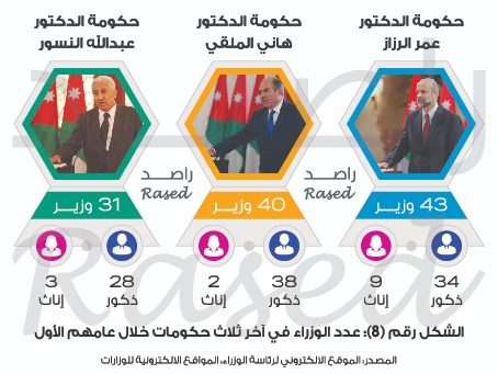 – حكومة الرزاز الأعلى عدداً في الوزراء في عامها الأول مقارنةً بآخر ثلاث حكومات.