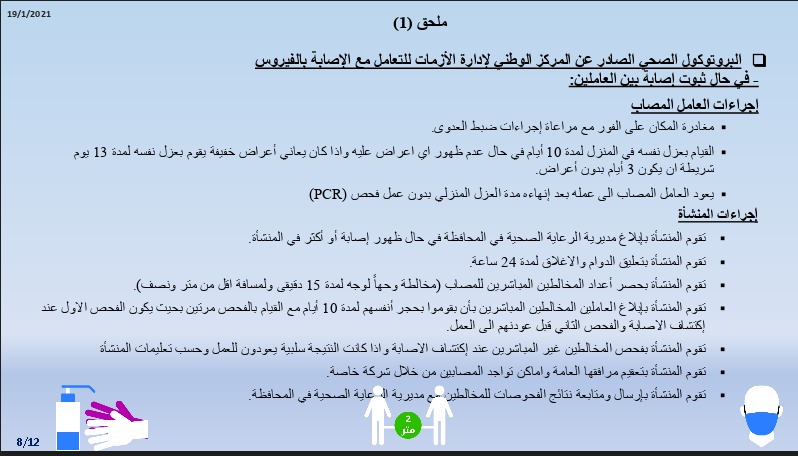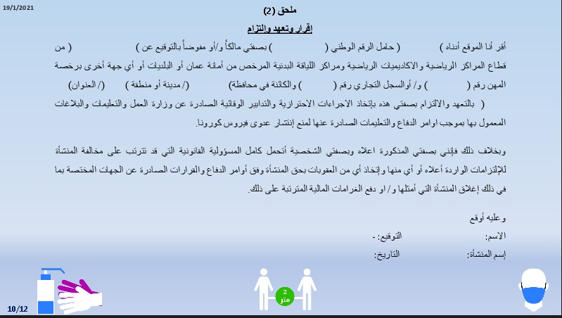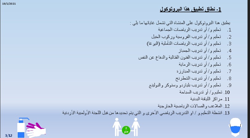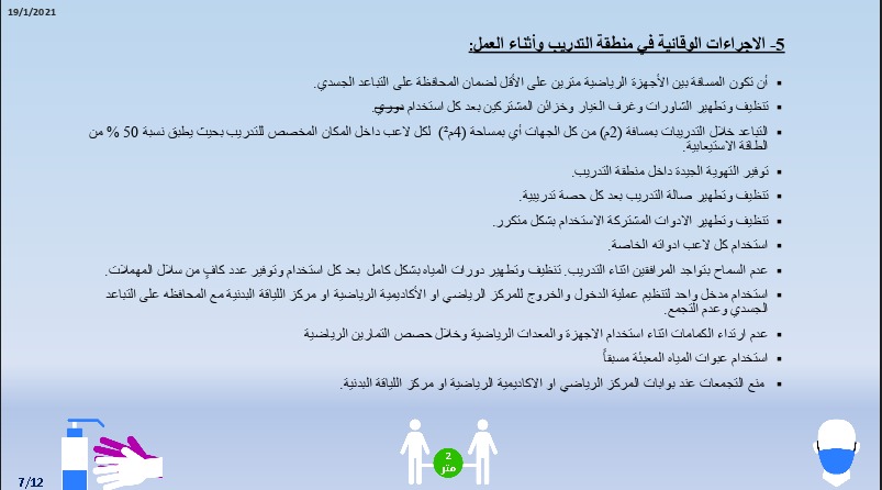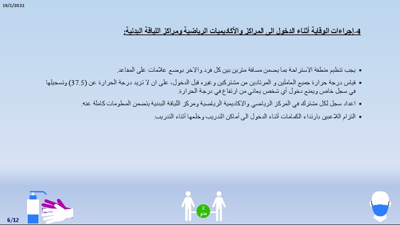 واحتوت التعليمات على إجراءات الوقاية قبل البدء بالعمل في المراكز الرياضية والاكاديميات الرياضية ومراكز اللياقة البدنية والاجراءات الوقائية المترتبة على العاملين فيها، واجرءات الوقاية أثناء الدخول اليها.