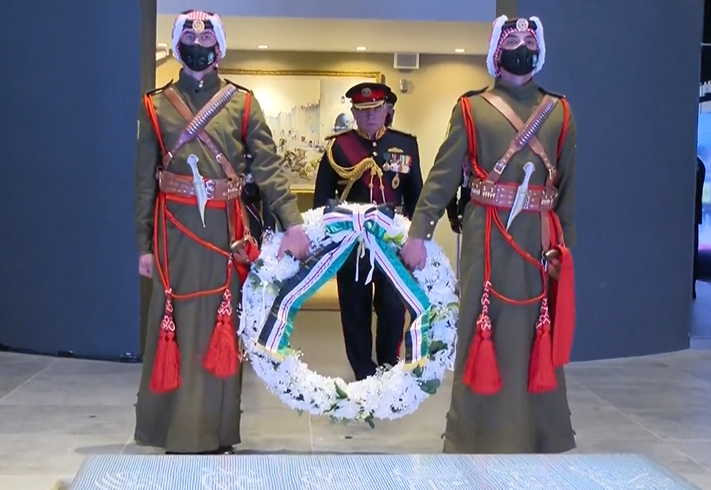 ووضع الملك إكليلاً من الزهور على ضريح الجندي المجهول داخل الصرح، وقرأ والحضور الفاتحة على أرواح الشهداء الأبرار الذين رووا بدمائهم الزكية ثرى الوطن وثرى فلسطين.