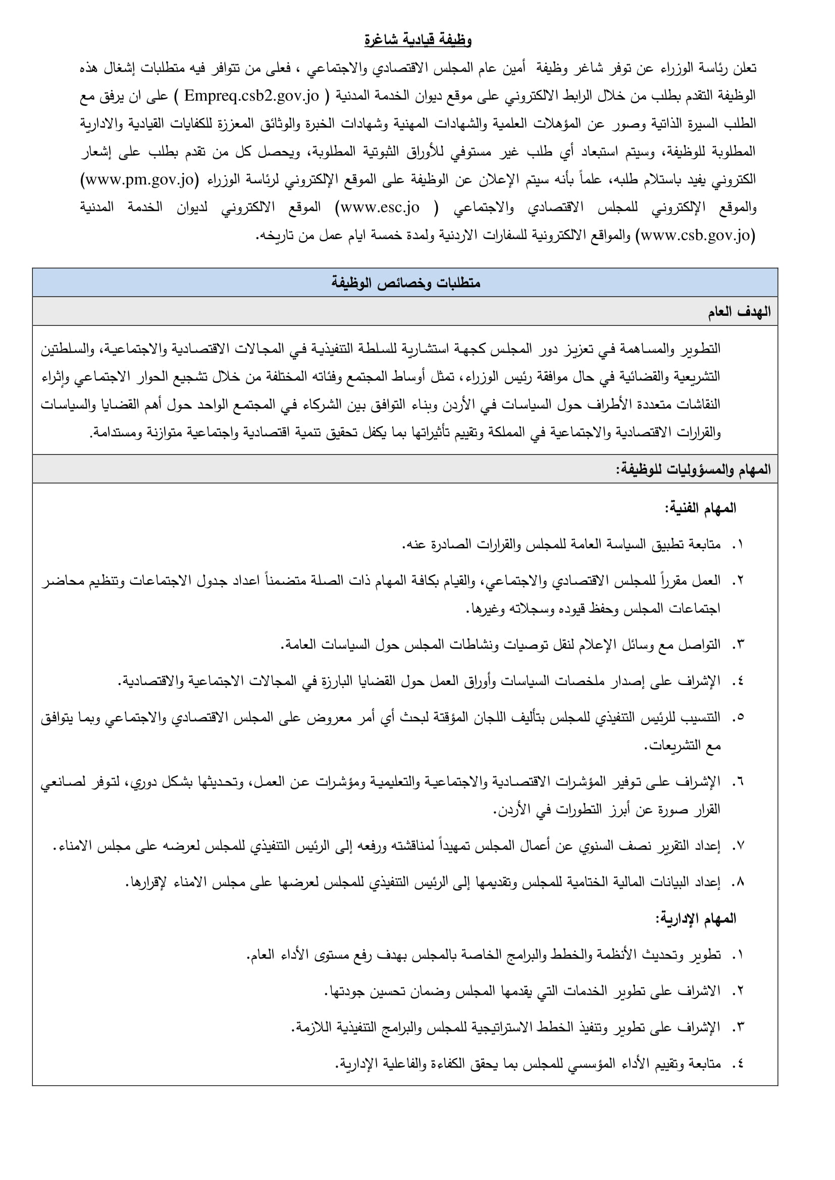 أعلنت رئاسة الوزراء، اليوم الأربعاء، عن توفر شاغر أمين عام المجلس الاقتصادي والاجتماعي.