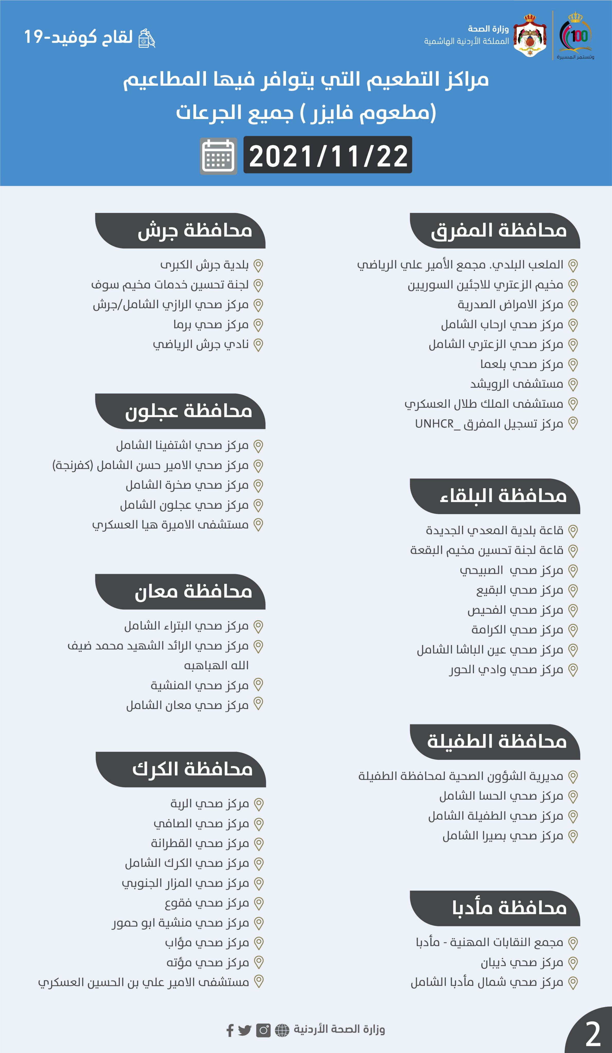 أعلنت وزارة الصحة، قائمة بأسماء مراكز اللقاحات وأنواعها الاثنين.