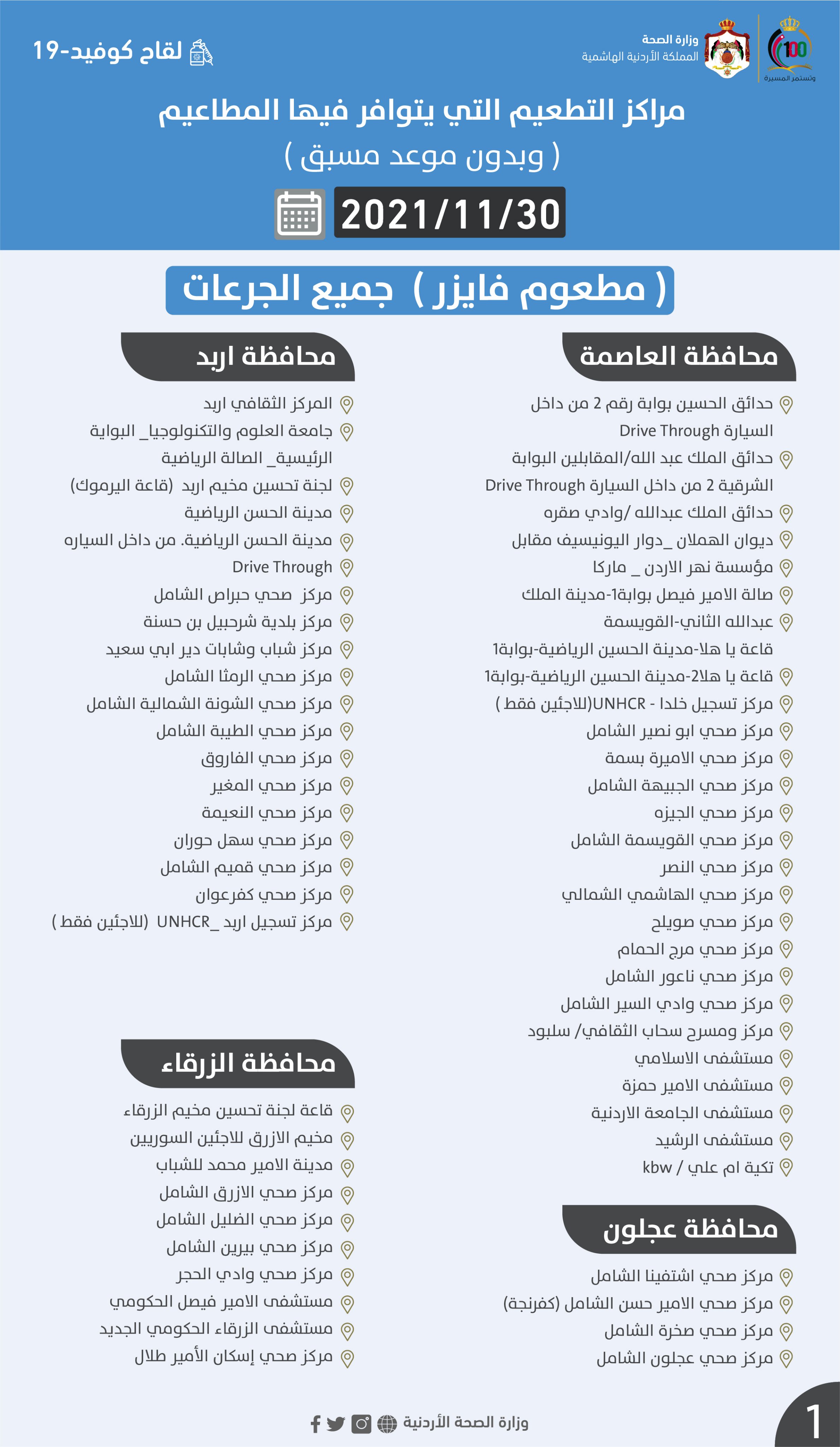 أعلنت وزارة الصحة عن مراكز التطعيم ليوم الثلاثاء التي يتوافر فيها المطاعيم (جميع الجرعات):