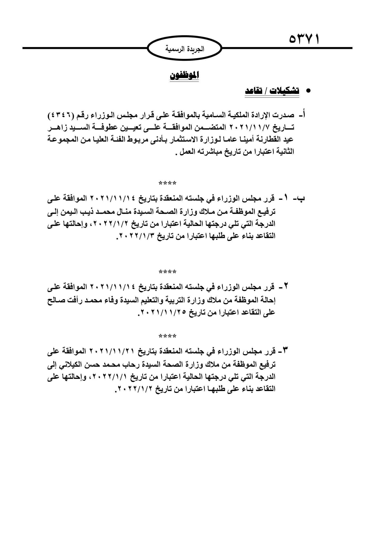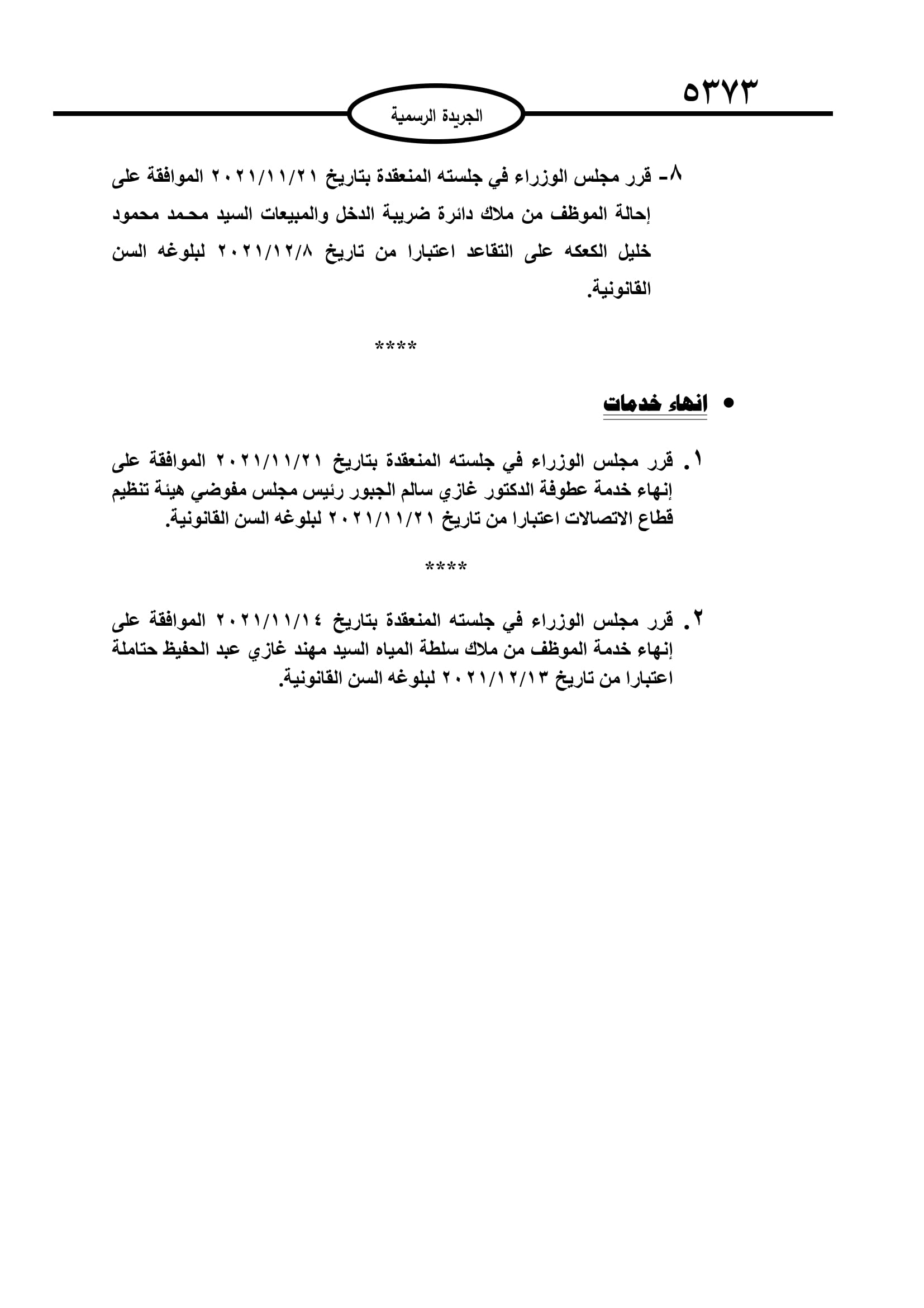 صدر في عدد الجريدة الرسمية اليوم الأربعاء، قرارات مجلس الوزراء باحالة عدد من موظفي الدولة الى التقاعد، وانهاء خدمات آخرين.