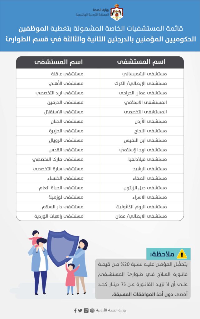 وأشارت إلى أنّ المستشفيات التي جرى توقيع ملاحق اتفاقيات التعاون معها هي مستشفيات (عاقلة، الأهلي، إربد التخصصي، الحرمين التخصصي، الاستقلال، الحنان، الجزيرة، الرويال، القدس، ماركا التخصصي، سارة التخصصي في محافظة المفرق، الخنساء، الحياة العام، دار السلام، الاسراء، راهبات الوردية في محافظة إربد، الشميساني، الايطالي في محافظة الكرك، عمان الجراحي، الاسلامي، التخصصي، الأردن، النجاح في محافظة إربد، إربد الاسلامي، لوزميلا، ابن النفيس في محافظة إربد، فيلادلفيا، الرشيد، الصفاء، جبل الزيتون في محافظة الزرقاء، الروم الكاثوليك، الايطالي عمان).
