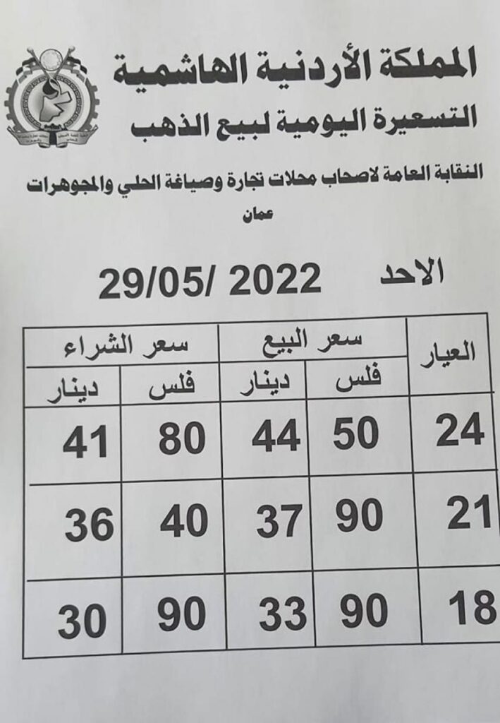 وكما بلغ سعر شراء غرام الذهب عياري 24 و18 لغايات الشراء من محلات الصاغة عند 44.50 و 33.90 دينارا على التوالي.