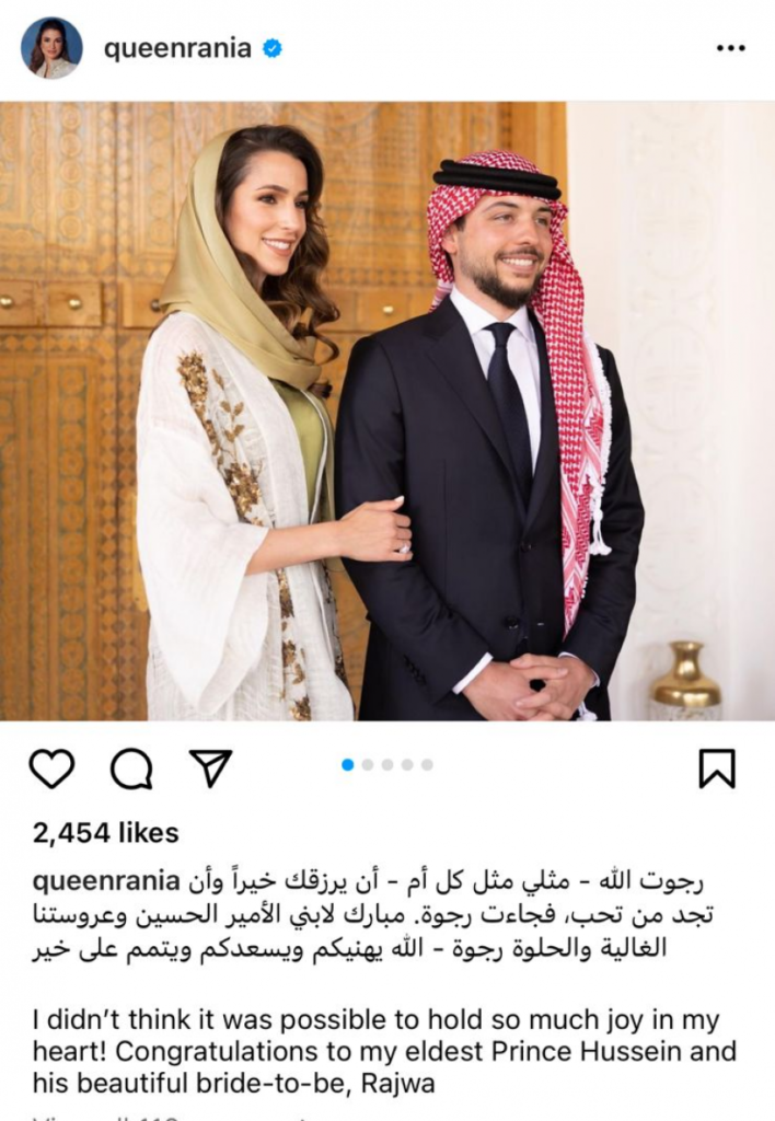 وقالت جلالتها، في تدوينة لها عبر منصات التواصل الاجتماعي، “رجوت الله – مثلي مثل كل أم – أن يرزقك خيراً وأن تجد من تحب، فجاءت رجوة. مبارك لابني الأمير الحسين وعروستنا الغالية والحلوة رجوة – الله يهنيكم ويسعدكم ويتمم على خير