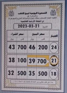 استقرت أسعار بيع الذهب محليا، اليوم الثلاثاء، بحسب تسعيرة نقابة العامة لأصحاب محلات تجارة وصياغة الحلي والمجوهرات .