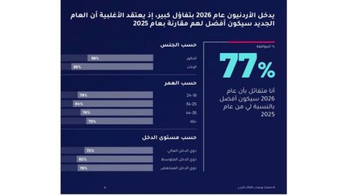 كشف مؤشر إبسوس العالمي لثقة المستهلك في الأردن للربع الرابع من العام الماضي أن 77 بالمئة من الأردنيين متفائلون بأن العام الحالي 2026 سيكون أفضل لهم مقارنة بالعام الماضي.