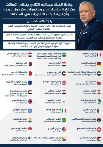 وتنشر وكالة الأنباء الأردنية (بترا) على موقعها الإلكتروني انفوجراف يوضح اسماء الزعماء وقادة الدول ورؤساء الحكومات الذين تلقى جلالة الملك الاتصالات منهم.