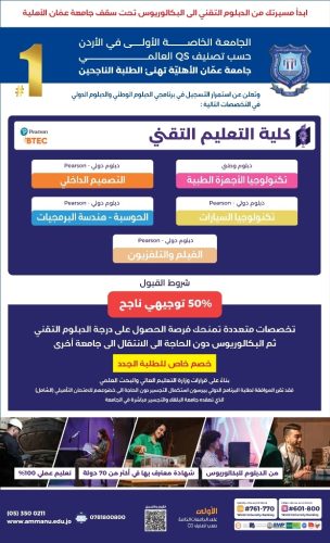 تعلن جامعة عمان الاهلية عن استمرار القبول والتسجيل بكلية التعليم التقني ببرنامجي الدبلوم الوطني والدبلوم الدولي للطلبة الناجحين بالثانوية العامة وحصلوا على معدل ما فوق 50 بالمائة ، للفصل الدراسي الثاني 2025-2026 ، في عدد من التخصصات المطلوبة في سوق العمل .