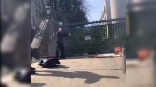 وفي التسجيل المصوّر الذي انتشر على وسائل التواصل الاجتماعي، ظهر الرجل الذي كان يرتدي زيا عسكريا وهو يعلن بأنه: “لن يكون متواطئا في إبادة جماعية” قبل أن يسكب على نفسه سائلا، ثم يضرم النار في نفسه وهو يصرخ “الحرية لفلسطين!” إلى أن سقط أرضا.